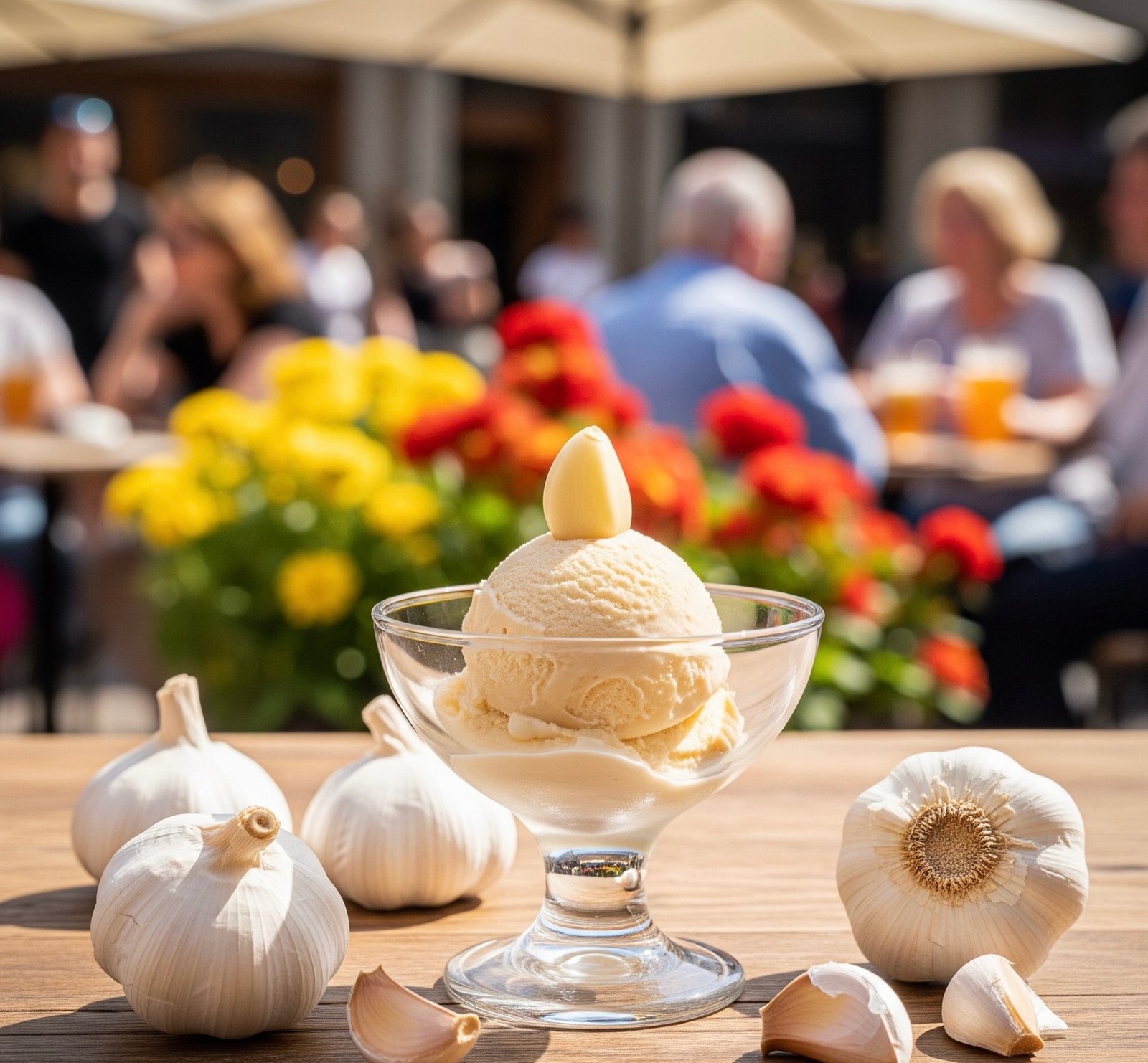 Garlic ice cream now joins the café’s growing list of questionable menu items, including beetroot latte, olive oil cappuccino, and something quietly labelled “pickle cake,” which no one’s had the courage to ask about.